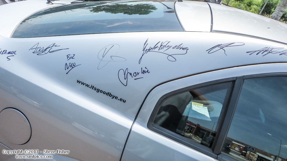 Usual superb services on motorways, food made to order, salad bar etc. By now the car was collecting interesting road kill and more signatures.